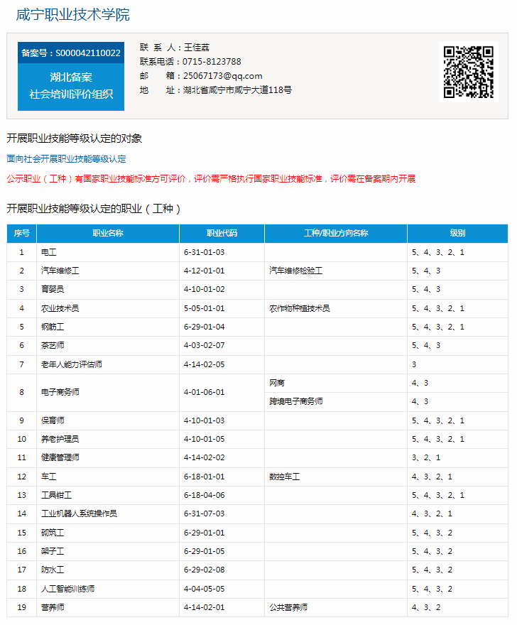 咸宁职业技术学院职业技能等级认定范围