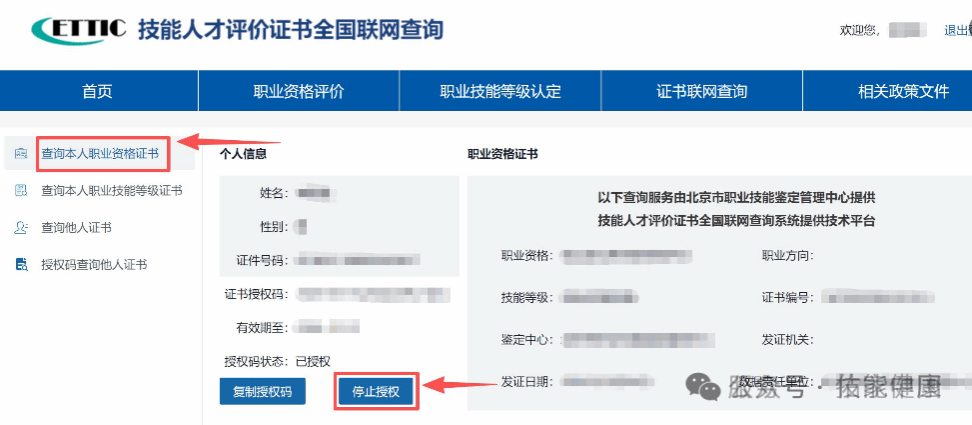 3、个人用户可通过授权码方式,分别授权他人查询本人名下职业资格证书或职业技能等级证书,查询结果显示证书的完整信息。授权码有效期一年,可随时登录账户终止授权。