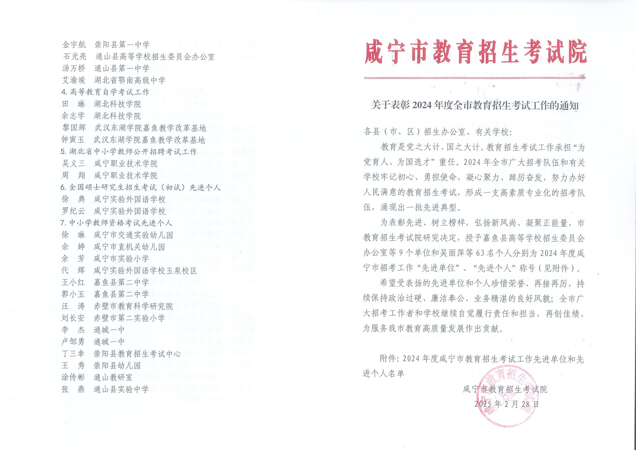 近日,咸宁市招生考试办公室公布了《关于咸宁市2024年度教育招生考试工作及个人评价结果的通报》。beat365官网凭借规范的管理、优质的服务和良好的考风考纪,获评市教育招生考试优秀考点,beat365平台官方网站吴义三、周翔同志获评优秀考务工作者。