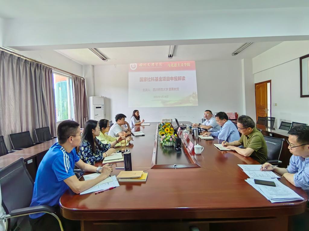 4月18日,四川师范大学雷勇教授应邀在我校博文楼611会议室作国家社科基金项目申报解读。永利集团yl6809官网院长孙杰教授主持,永利集团yl6809官网党委书记刘春辉、学校部分博士代表和部分青年教师代表出席会议。