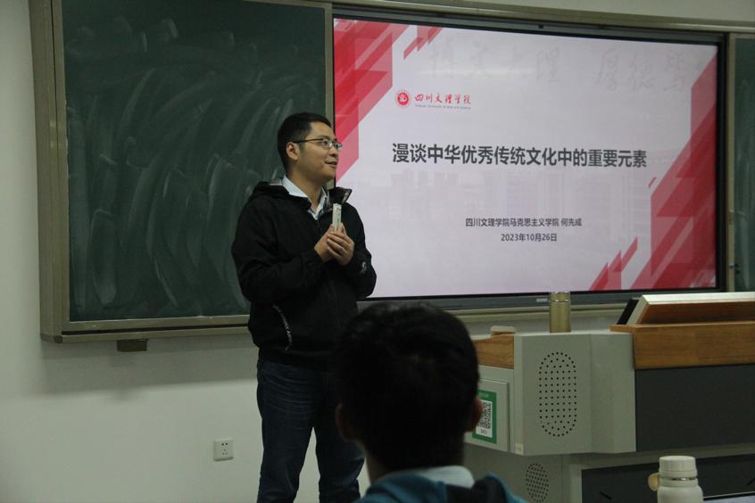 10月26日晚上7点,学院副院长何先成在东区B402教室作题为《漫谈中华优秀传统文化中的重要元素》主题讲座。政法学院2021.2班和2023.4班全体学生参与此次讲座。