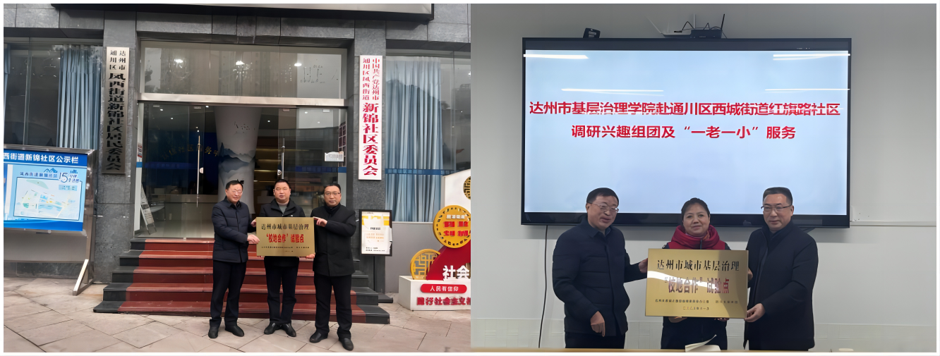 2024年1月8日,永利集团yl6809官网党委书记刘春辉、院长孙杰一行赴通川区凤西街道新锦社区、西城街道红旗路社区进行调研并举行“校地合作”建设点授牌仪式,通川区组织部常务副部长李军一行陪同。