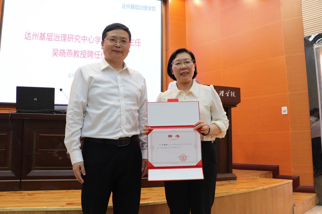 讲座开始前举行了聘任仪式,学校校长侯忠明教授为吴晓燕教授颁发了达州基层治理研究中心学术委员会主任的聘书。