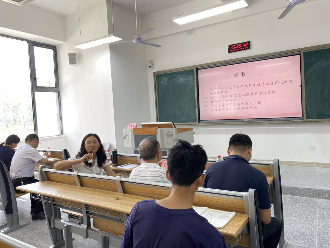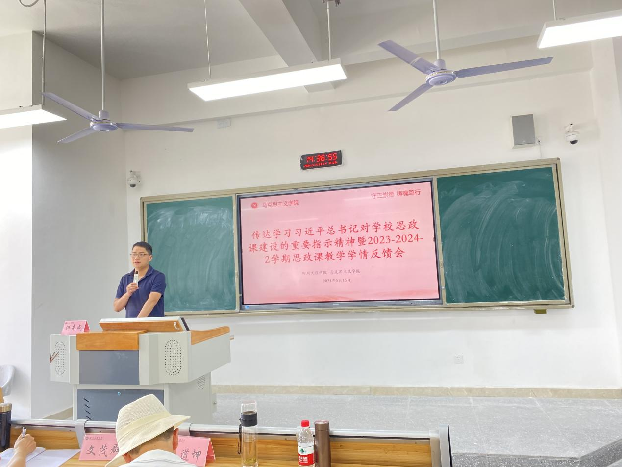 为进一步推动思政课课堂教学改革,提高思政课教学质量, 5月15日下午,马克思主义学院在东区B108教室传达学习习近平总书记对学校思政课建设的重要指示精神,并召开2023-2024-2学期思政课教学学情反馈会。学校教学督导专家王道坤教授出席并讲话,副院长何先成主持并领学。