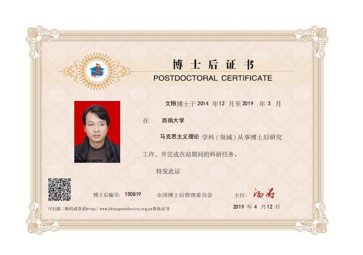 近日,从西南大学获悉,永利集团官网文翔教授于2014年12月-2019年3月在西南大学马克思主义理论学科(领域)从事博士后研究工作,完成在站期间的科研任务,日前顺利出站。